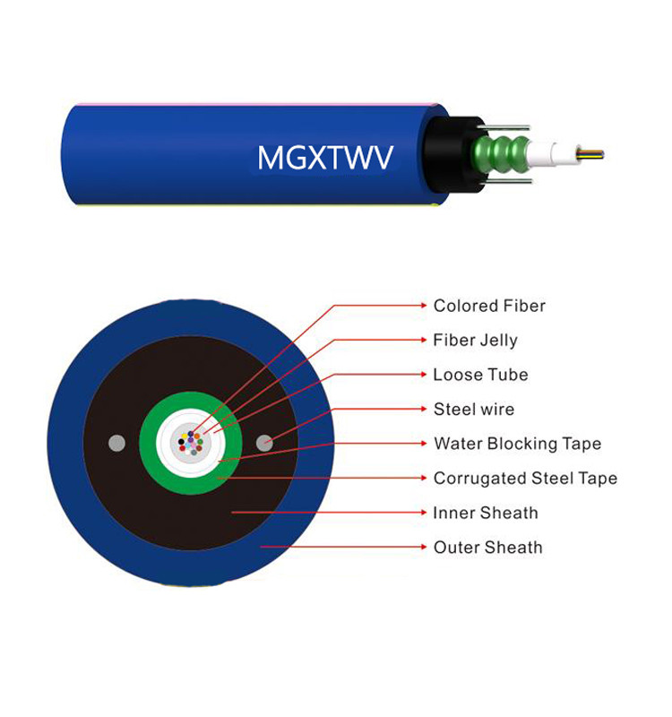 เส้นใยของสายเคเบิลใยแก้วนำแสง MGXTSWV 200μmหรือ250μmอยู่ในท่อหลวมซึ่งทำจากพลาสติกโมดูลัสสูงหลอดบรรจุด้วยสารเติมกันน้ำหลอดถูกห่อด้วยชั้นของ PSP ตามยาวระหว่าง PSP และวัสดุกั้นน้ำแบบท่อหลวมถูกนำไปใช้เพื่อให้สายเคเบิลมีขนาดกะทัดรัดและกันน้ำได้ลวดเหล็กคู่ขนานสองเส้นวางอยู่ที่ทั้งสองด้านของเทปเหล็ก เหนือปลอก PE ด้านในแบบบางสายเคเบิลใยแก้วนำแสงมีปลอกหุ้มด้านนอกโพลีเอทิลีน (PE)สายเคเบิลท่อลำแสงกลาง: จากภายในสู่ภายนอกสำหรับใยแก้วนำแสง, ครีมใยแก้วนำแสง, หลอดหลวม, ลวดเหล็กบาง ๆ (มีวงกลมอยู่รอบ ๆ ), เหล็ก, ปลอก PE, ปลอกหน่วงไฟ